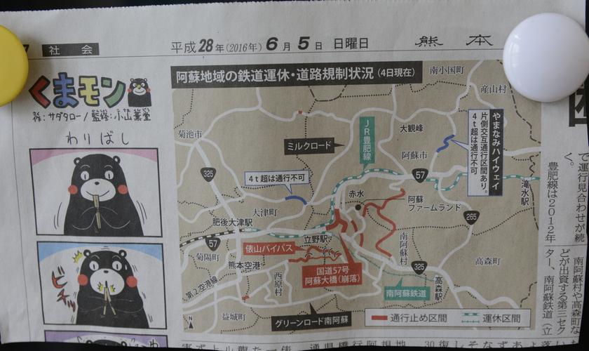 阿蘇のカルデラ内は平地部分の走行は、 かなり走行できました。 カルデラ内から熊本市内に行く道が2本しかなく、 もともとは風景写真家や地元の限られた人たちが使用する道で 両方とも急坂で、Uターンするようなカーブがあり、 大型車は対向車線にかなりはみ出さないと 曲がれない個所が数か所あるため、 平日に遊びで走行するのは避けられれば避けたほうが良い と思われます。 現状の熊本市−阿蘇カルデラ間 主要幹線は ・ 大津(おおづ)からミルクロード−二重峠−赤水 ・ 空港-俵山(たわらやま)通りーらくのうマザーズ牧場−グリーンロード−南阿蘇 久石 この2ルートです。 阿蘇震災関連情報 http://www.asocity-kanko.jp/ja/news/ リンク先で現状の通行可能箇所など確認可能です。 (阿蘇方面の通行可能マップを参照) |