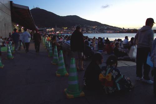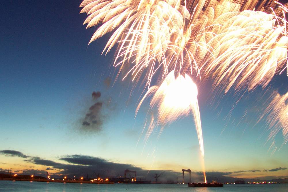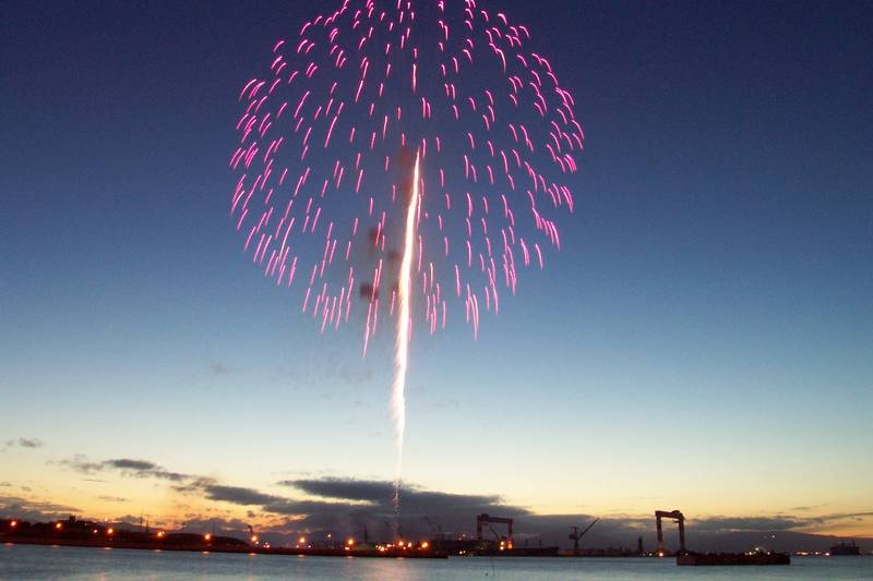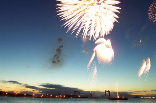 港に浮かんだ艀(ハシケ)?からも 打ち上がります。 おもしろかったのは、4号玉〜10号玉(尺玉) を順々に解説付きで打ち上げて、サイズの違い を放送で説明されていた事です。 他にも動く船から投下して、海面から 開くタイプの花火もありましたが、 写真が上手く撮れませんでした。 |